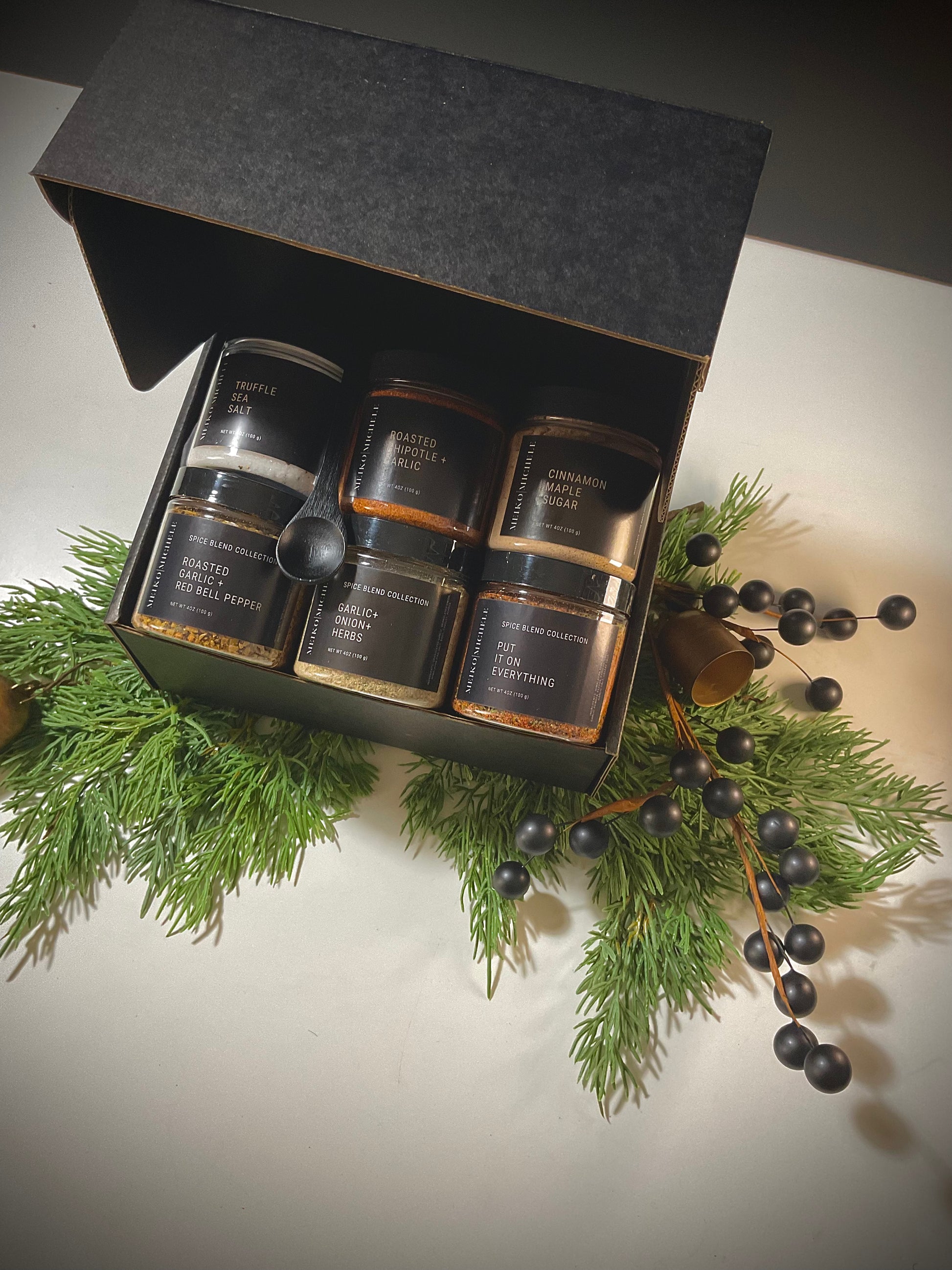 Meet theSIGNATUREsix — the bold, elevated collection crafted for the home chef who wants flavor with presence. This set brings together six of MeikoMichele’s most celebrated blends: warm and versatile Put It On Everything, aromatic Garlic + Onion + Herb, vibrant Roasted Garlic + Red Bell Pepper, smoky Roasted Chipotle + Garlic, indulgent Truffle Salt, and comforting Maple Cinnamon Sugar.